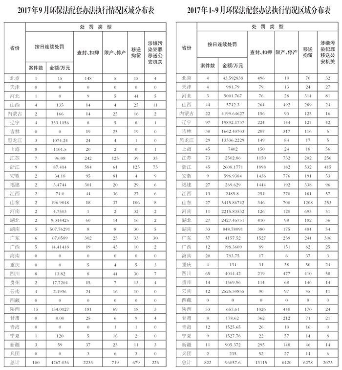 环境保护部今日向媒体通报各地环保部门2017年9月执行《环境保护法》配套办法及移送环境犯罪案件的情况。对1~9月份案件较多的浙江、山东、安徽、江苏、广东、福建等地进行表扬。对零案件县(区)较多的河南、云南两省及信阳、郑州、西宁、张家口等4市通报批评。